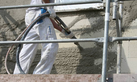 Der Putzaufbau eines konventionellen Fassadenverputzes: Zementanspritzwurf, Grundputz und Deckputz. Für den Deckputz sind Farben und Formen fast keine Grenzen gesetzt.
